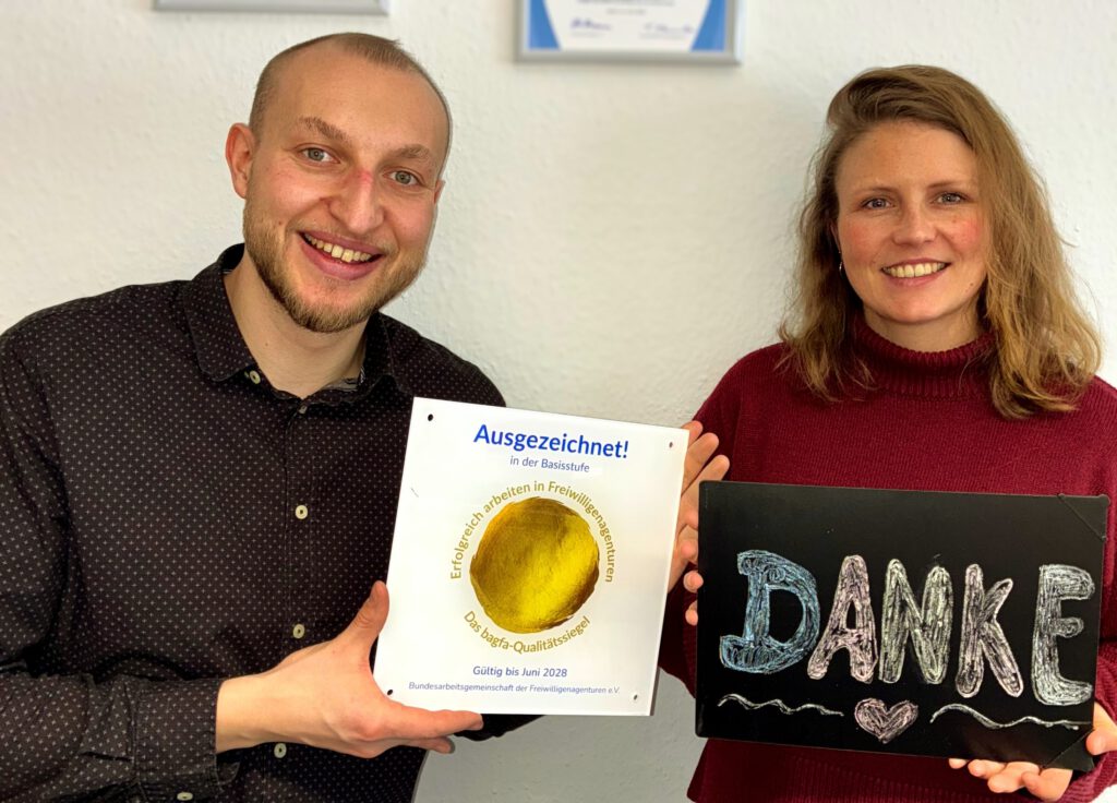 Zwölf Monate haben Niklas Neumann und Lisa Schulz mit viel Engagement und Ausdauer an der Zertifizierung gearbeitet, um zu zeigen: das Freiwilligenbüro ist ein verlässlicher Profi in seinem Gebiet. „Das Siegel steht bundesweit für verbindliche Qualitätsstandards in der Arbeit von Freiwilligenagenturen – und genau diese Qualität konnten wir nun nachweisen“ hebt Niklas Neumann hervor.